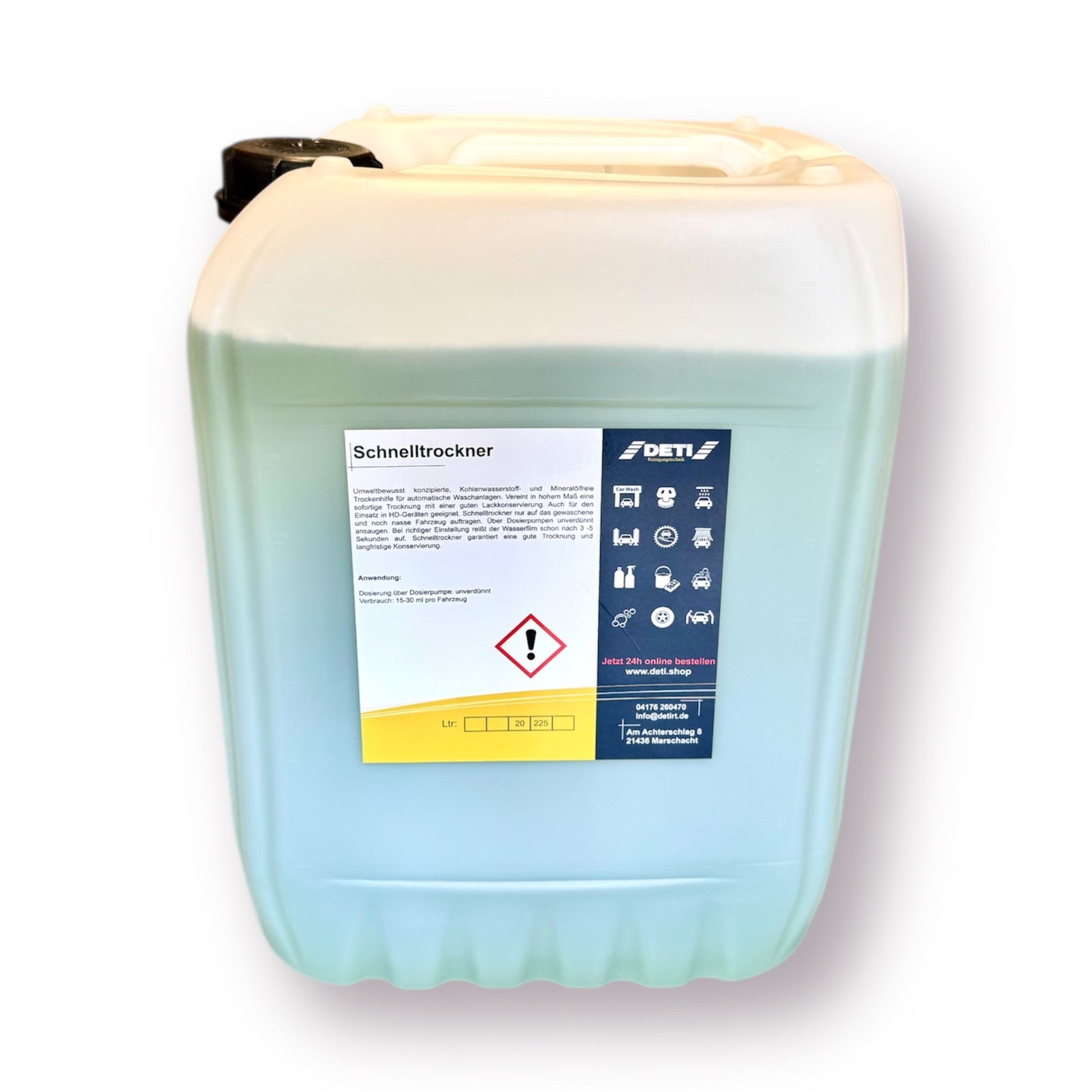 Umweltbewusst konzipierte, Kohlenwasserstoff- und Mineralölfreie Trockenhilfe für automatische Waschanlagen. Vereint in hohem Maß eine sofortige Trocknung mit einer guten Lackkonservierung. Auch für den Einsatz in HD-Geräten geeignet. Schnelltrockner 94 nur auf das gewaschene und noch nasse Fahrzeug auftragen. Über Dosierpumpen unverdünnt ansaugen. Bei richtiger Einstellung reißt der Wasserfilm schon nach 3 -5 Sekunden auf. Schnelltrockner 94 garantiert eine gute Trocknung und langfristige Konservierung.