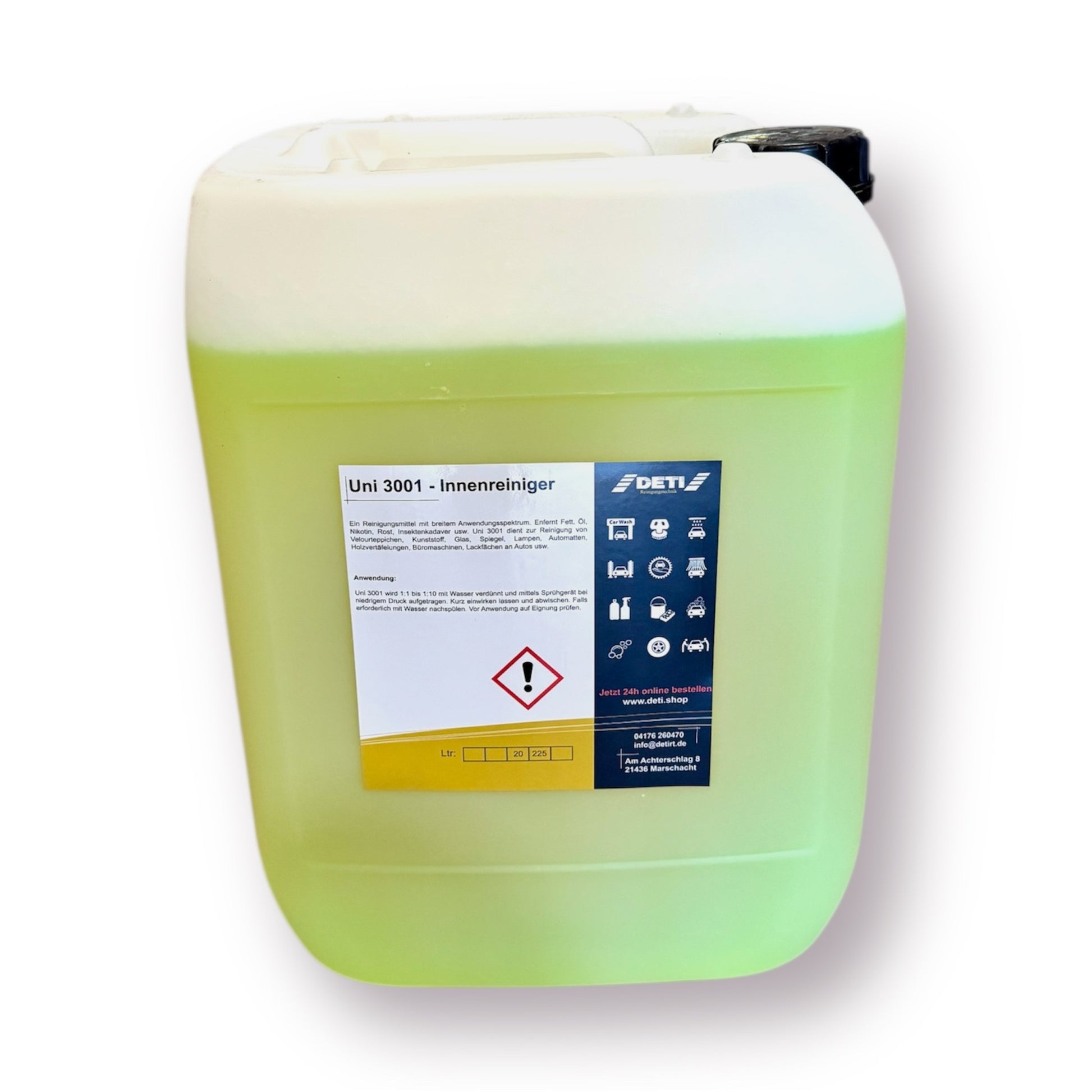 Ein Reinigungsmittel mit breitem Anwendungsspektrum. Enfernt Fett, Öl, Nikotin, Rost, Insektenkadaver usw. Uni 3001 dient zur Reinigung von Velourteppichen, Kunststoff, Glas, Spiegel, Lampen, Automatten, Holzvertäfelungen, Büromaschinen, Lackfächen an Autos usw.